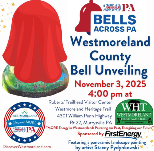 Bells Across PA Unveiling in Murrysville Today - The Pennsylvania Commission for the United States Semiquincentennial (America250PA) is unveiling a liberty bell as part of its Bells Across PA program today, Monday, Nov. 3, at 4 p.m. at the Westmoreland Heritage Trail Head in Murrysville. The program gives artists across the county opportunity to decorate a three-foot fiberglass bell to commemorate America’s 250th birthday. If you are available, I invite you to join the fun!